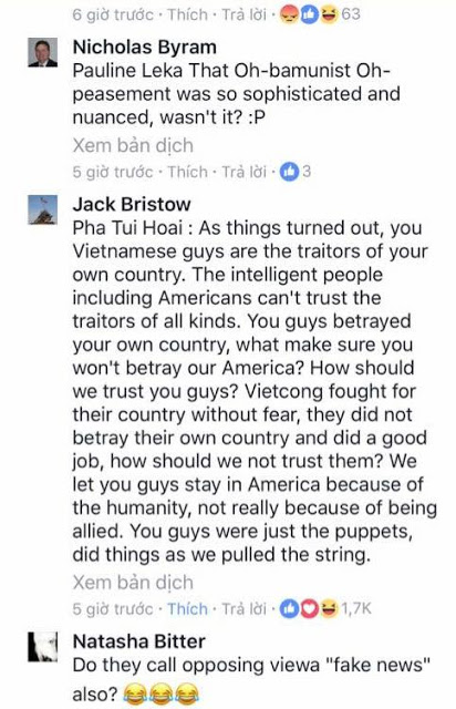 Phản ứng với dòng trạng thái của Trump, một nick name là Pha Tui Hoai đã viết: “Đừng tin Việt Cộng, ngài Tổng thống“. Bình luận đó đã bị phản ứng dữ dội. Trong số đó có Nick name Jack Bristow trả lời rằng:
