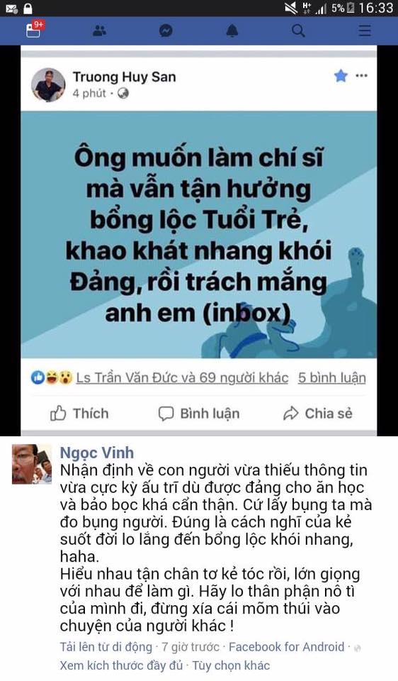 Đọc cái stt của ôsin Huy Đức với cái cmt của Ngọc Vinh mà thấy hài vãi, đây là hai kẻ có một thời cùng là chiến hữu của báo tuổi trẻ, nói cho đúng thì hai kẻ này đều hiểu tường tận chân tơ kẽ tóc của nhau.