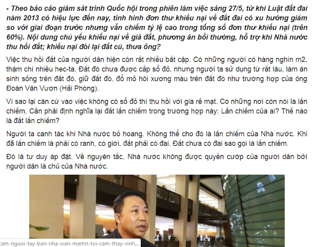Loại trừ việc báo VTV News nhét chữ vào mồm ông, tôi nghĩ nhiều khả năng câu này là do ông phát biểu. Đọc câu này, ông nói ông Đoàn Văn Vươn ở Hải Phòng có đất mà chưa được cấp sổ đỏ, sử dụng từ lâu, làm ăn trên đất đó, giữ đất đó, đổ mồ hôi xương máu trên đất đó… mà cuối cùng thì chính quyền thu hồi đất của ông Vươn.