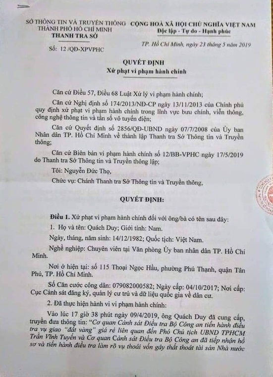 Quyết định xử phạt của Thanh tra Sở Thông tin truyền thông đối với ông Quách Duy.