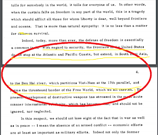 2. Tuyên bố “Dâng miền Nam cho Mỹ“, Ngô Đình Diệm hùng hồn: “Liên quan tới vấn đề an ninh, biên giới của Mỹ không ngừng ở bờ biển Đại Tây dương và Thái Bình dương mà kéo dài, tại Đông Nam Á, tới sông Bến Hải, vốn chia đôi Việt Nam ở vĩ tuyến thứ 17, tạo thành cái biên giới đã bị đe dọa của Thế giới Tự do mà chúng ta đều trân trọng”.