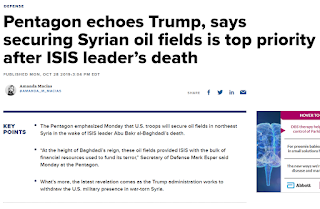 – Trump và Lầu Năm Góc tuyên bố để phòng ngừa trong tương lai ISIS có thể tái chiếm các giếng dầu vùng Đông Bắc Syria thì quân đội Mỹ sẽ đưa quân đến phong tỏa, kiểm soát chúng. Đó là ‘chuyện cấp thiết nhất’ (theo nguyên văn tuyên bố của Trump và LNG) của quân đội Mỹ hiện nay. Ai dám ngăn cản hay mon men đến gần sẽ bị Mỹ bắn bỏ!