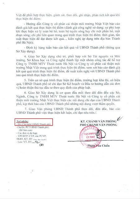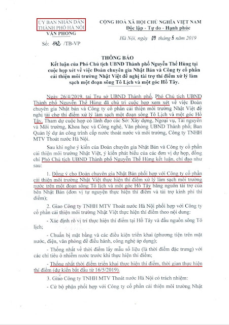 Chứng cứ được đưa ra để chứng minh anh Chung con nói sai là một THÔNG BÁO của UBND Thành phố Hà Nội. Đó là Thông báo “Kết luận của Phó Chủ tịch UBND Thành phố Nguyễn Thế Hùng tại cuộc họp xét về việc Đoàn chuyên gia Nhật Bản và Công ty cổ phần cải thiện môi trường Nhật Việt (JVE) đề nghị tài trợ thí điểm xử lý làm sạch một đoạn sông Tô Lịch và một góc Hồ Tây“. Theo đó, UBND Thành phố Hà Nội đồng ý cho Đoàn chuyên gia Nhật Bản và Công ty cổ phần cải thiện môi trường Nhật Việt (JVE) thí điểm làm sạch một đoạn sông Tô Lịch và một góc Hồ Tây và thời gian dự kiến thực hiện vào ngày 16/5/2019. Mời xem văn bản dưới đây: