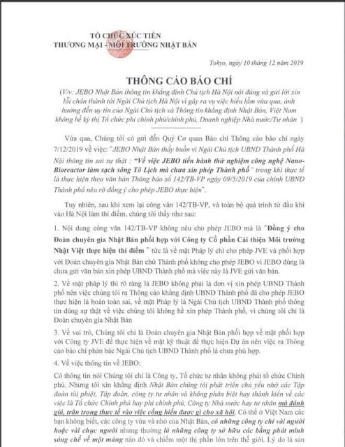 Sáng nay 10/12/2019, Tổ chức Xúc tiến Thương mại – Môi trường Nhật Bản (JEBO) thông qua Công ty Cổ phần Cải thiện Môi trường Nhật Việt (JVE) phát đi thông cáo báo chí khẳng định “Chủ tịch UBND TP Hà Nội Nguyễn Đức Chung phát biểu về việc JEBO chưa về xin phép là hoàn toàn đúng”.