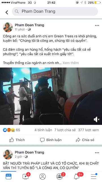 Trên fb của Đoan Trang từ sáng nay đã liên tục cập nhật một thủ lĩnh nhóm Green Trees bị Bộ công an triệu tập về trụ sở Trực ban hình sự điều tra về hành vi xâm phạm An ninh quốc gia.