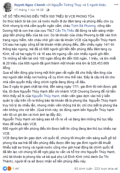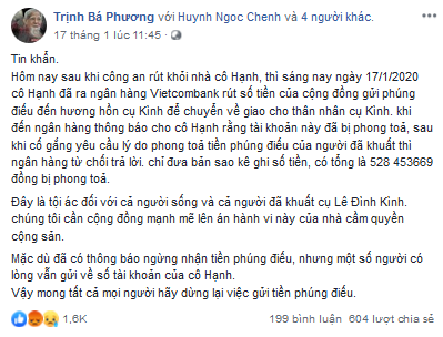 Lấy lý do bị công an chặn cửa trong vòng 1 tuần kể từ hôm nhóm khủng bố Đồng Tâm sát hại 3 chiến sĩ công an đến sáng 17/1, Nguyễn Thúy Hạnh mới ra ngân hàng rút tiền. Vietcombank thông báo rằng tài khoản đã bị phong tỏa, đồng thời đưa bà Hạnh bảng kê cho thấy đã có 528.453.669 VNĐ được gửi vào tài khoản. Trịnh Bá Phương thông báo tin này lúc 11h45’ ngày 17/1, Trịnh Bá Tư đăng bảng kê lúc 12h53’ cùng ngày, và Huỳnh Ngọc Chênh (chồng Hạnh) xác nhận rằng Phương chủ trì quyên tiền vào lúc 16h28’ cùng ngày: