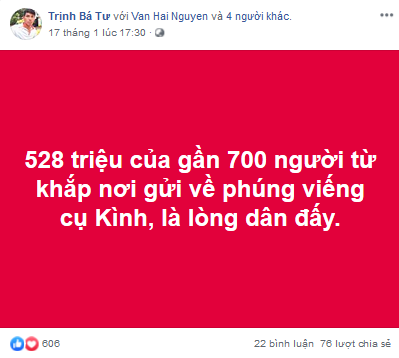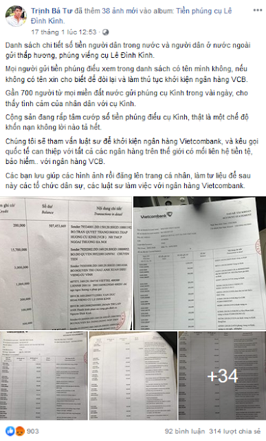 Xem xét một cách nghiêm túc lại toàn bộ quá trình quyên tiền “hỗ trợ gia đình cụ Kình” thì thấy, đợt quyên tiền đầu tiên bắt đầu lúc 21h34’ ngày 12/01, khi Trịnh Bá Phương kêu gọi cộng đồng gửi tiền để phúng viếng ông Kình, đồng thời giúp đỡ gia đình ông. Phương nói mình “sẽ chịu trách nhiệm chính” về hoạt động này, và đề nghị gửi tiền vào tài khoản Vietcombank, số 0611001987139 của Nguyễn Thúy Hạnh. Xem ảnh trên cùng để kiểm chứng.
