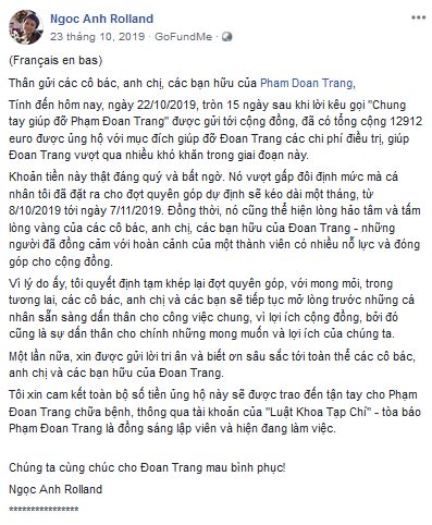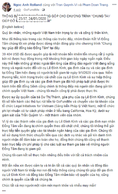 Ngày 24/1, Nguyễn Thị Ngọc Anh tuyên bố rằng đợt quyên tiền đã kết thúc, với số tiền quyên được là 39.484 USD (tức khoảng 914.839.065 Vnđ). Số tiền sẽ được gửi vào tài khoản của tổ chức Legal Initiatives for Vietnam (tức Luật khoa Tạp chí), và nằm dưới sự quản lý của Trần Quỳnh Vi, trước khi được gửi cho người nhận ở Việt Nam bằng nhiều cách: