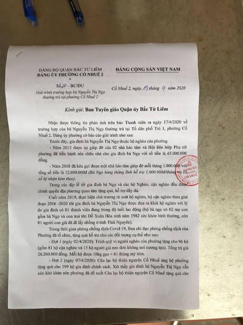 Tổ dân phố Trù 1 nơi bà Ngọ sinh sống và lãnh đạo phường Cổ Nhuế 2 cho biết, trước đây, gia đình bà Ngọ thuộc hộ nghèo của phường nhưng nay đã khác và bà Ngọ không đơn độc, không khó khăn như Trần Cường mô tả.