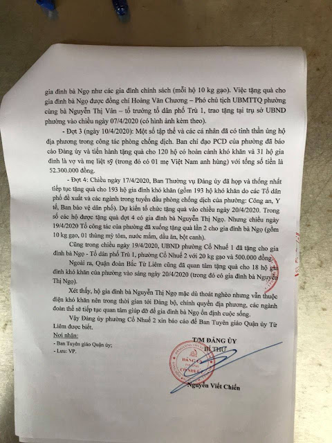 Lãnh đạo phường Cổ Nhuế 2 thông tin, trong thời gian phòng chống dịch Covid 19, xét thấy gia đình bà Ngọ vẫn còn khó khăn nên phường đã đề xuất Câu lạc bộ thiện nguyện Cổ Nhuế tặng quà cho gia đình bà Ngọ như các gia đình chính sách, mỗi hộ 10kg gạo. Tiếp đó, ngày 19/4, tổ công tác của phường Cổ Nhuế 2 đã xuống tặng quà hỗ trợ lần 2 cho gia đình bà Ngọ gồm 10kg, 1 thùng mỳ tôm, nước mắm, dầu ăn, bột canh. Cũng trong ngày, UBND phường Cổ Nhuế 2 đã tặng cho gia đình bà Ngọ 20kg gạo và 500.000 đồng…