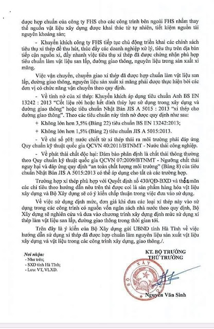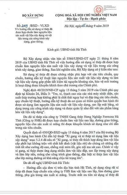– Bộ Xây dựng đã có ý kiến tại Văn bản số 51/BXD-VLXD, trong đó khẳng định xỉ thép của Công ty Formosa được phép sử dụng vào làm vật liệu san lấp, đường giao thông như chỉ dẫn trong các tiêu chuẩn.