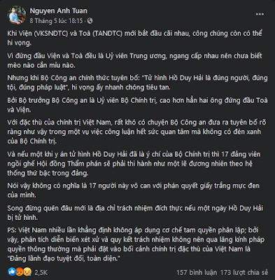 Tiêu biểu trào lưu “nhà nhà làm thẩm phán”, “người người làm chuyên gia tư pháp” này, Nguyễn Anh Tuấn, đệ tử của Trịnh Hội, thành viên tổ chức phản động VOICE đội lốt “xã hội dân sự”, cũng có bài viết trên Facebook tung tin rằng, vụ án này được Bộ Trưởng Bộ công an Tô Lâm, Ủy viên Bộ Chính trị đánh giá “tử hình Hồ Duy Hải là đúng người, đúng tội, đúng luật” thì không còn hy vọng “công lý” cho Hồ Duy Hải nữa vì phán xét của ông Tô Lâm là phán xét, là quyết định của Bộ Chính trị, là được Bộ Chính trị bật “đèn xanh” rồi, trong khi Viện trưởng Viện Kiểm sát, Chánh án TANDTC mới chỉ là Ủy viên Trung ương Đảng. Rồi Tuấn quy kết luôn thành Bộ Chính trị Việt Nam đã chỉ đạo tử hình Hồ Duy Hải, vì vậy Bộ Chính trị mới là cơ quan phải chịu trách nhiệm về cái chết của Hải. Ý đồ của Tuấn rõ ràng muốn nhắm đến tấn công vào chế độ chính trị Việt Nam hiện nay là Đảng lãnh đạo toàn diện, Đảng thâu tóm, can thiệp đến đâu thì công lý cũng bị bóp méo