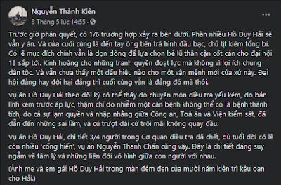 Thứ ba, họ viết rằng phiên giám đốc thẩm của vụ Hồ Duy Hải chỉ là một nước cờ “đấu đá nội bộ” của Tổng Bí thư Nguyễn Phú Trọng, nhằm đưa “những người thân cận” lên trong Đại hội XIII. Điển hình cho lập luận này là post của Nguyễn Thành Kiên: