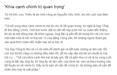 Khi trả lời phỏng vấn BBC, Nguyễn Hữu Vinh cũng nói rằng phiên giám đốc thẩm này liên quan đến Đại hội XIII. Tuy nhiên, ông Vinh đưa ra một quan điểm hơi khác, khi cho rằng việc này hợp lý về mặt chính trị: