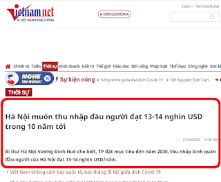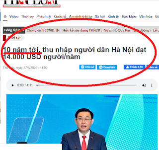 Sự thật là, vào sáng 27/6/2020, TP Hà Nội tổ chức Hội nghị xúc tiến đầu tư với chủ đề “Hà Nội 2020 – Hợp tác đầu tư và phát triển” với mục tiêu vực dậy nền kinh tế sau đại dịch COVID-19. Tại hội nghị, Bí thư Thành uỷ Hà Nội Vương Đình Huệ cho hay, trong dự thảo báo cáo Chính trị chuẩn của ĐH Đảng bộ lần thứ 17 (dự kiến diễn ra cuối tháng 10-2020), Hà Nội đặt mục tiêu trở thành một đô thị xanh, văn minh, hiện đại. Tới năm 2025, Hà Nội là TP có năng lực cạnh tranh cao trong nước và khu vực, đến năm 2030 là TP cạnh tranh quốc tế với thu nhập bình quân đầu người 13-14 nghìn USD/đầu người, đến 2045 Hà Nội là TP toàn cầu với thu nhập bình quân đầu người 36 nghìn USD. Mời xem ảnh chụp màn hình từ báo Pháp Luật Online, hoặc bấm vào đây hoặc đây để xem bài gốc.