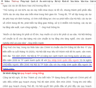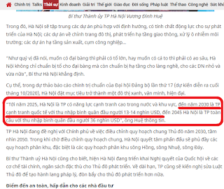 Tương tự như thế, báo Vietnamnet cũng viết rõ: “Tới năm 2025, Hà Nội là TP có năng lực cạnh tranh cao trong nước và khu vực, đến năm 2030 là TP cạnh tranh quốc tế với thu nhập bình quân đầu người 13-14 nghìn USD, đến 2045 Hà Nội là TP toàn cầu với thu nhập bình quân đầu người 36 nghìn USD”. Mời bấm vào đây để xem bài gốc.