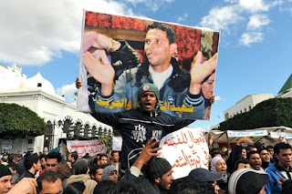 Người biểu tình giơ cao hình ảnh người bán hàng rong Mohamed Bouazizi tại Tunisia. Ảnh: New York Times