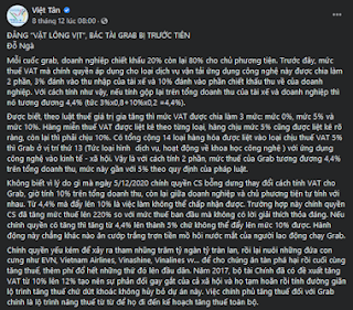 Ngày 07/12, hàng trăm tài xế GrabBike đã tập trung tại trụ sở công ty Grab ở phố Duy Tân, Hà Nội, để phản đối mức khấu trừ mới sau khi áp dụng thuế VAT trên mỗi cuốc xe. Các tài xế cho rằng sau khi Nhà nước chuyển sang tính 10% thuế VAT trên tổng doanh thu của mỗi cuốc xe, rồi để công ty và tài xế tự chia mức thuế phải nộp với nhau (thay vì tính trên 3% thu nhập của tài xế và 10% tiền thu về của doanh nghiệp như trước), lượng thuế mà tài xế phải nộp tăng vọt lên, khiến họ không đủ sống.