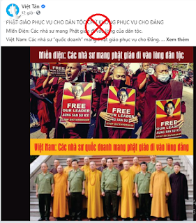 Trên trang mạng xã hội của mình, Việt Tân và một số đối tượng chống đối đang rêu rao bài viết với tiêu đề “Phật giáo phục vụ cho dân tộc chứ không phục vụ cho Đảng”. Theo đó, các đối tượng tung ra luận điệu cho rằng việc các nhà sư tại Myanmar đi xuống đường biểu tình là hành động “đi vào lòng dân”. Ngược lại, việc các nhà sư tại Việt Nam gắn bó chặt chẽ với Đảng, Nhà nước là “Các nhà sư “quốc doanh” mang Phật giáo phục vụ cho Đảng”, “các nhà sư không chân chính nằm trong hệ thống Đảng tham dự các phiên họp để nhận chỉ thị của Đảng giao phó, lấy danh nghĩa Phật giáo tuyên truyền cho Đảng”v.v…