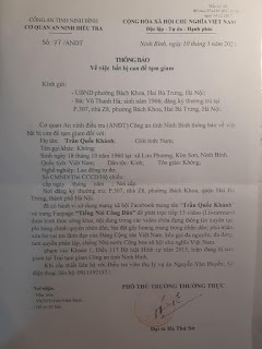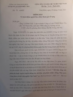 Trưa nay, khi đang chuẩn bị gửi văn bản đến cơ quan ANĐT Công an tỉnh Ninh Bình để yêu cầu xác nhận thông tin (do trước đó gia đình ông Khánh thông báo và một số báo đưa tin) thì nhận được thông báo của Cơ quan này.