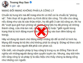 Mang danh là nhà báo có kinh nghiệm nhưng ngay cả việc phân biệt đâu là phòng vệ, đâu là tàng trữ vũ khí, đâu là hành vi giết người, đâu là chống người thi hành công vụ mà ông còn làm không được thì phải xem xét lại những năm qua, ông đã viết gì. Với vụ Đồng Tâm này, xin hỏi Trương Huy San là ai mà đòi chuyển đổi tội danh cho các bị cáo? Trương Huy San là ai mà đòi ngổm xổm lên nền tư pháp của Việt Nam. Trong khi, mọi hình ảnh, video liên quan đến vụ việc đã được công khai rõ ràng, thậm chí lời khai, cáo trạng, tình tiết, diễn biến của các phiên tòa cũng được công khai minh bạch. Bản ản dành cho các bị cáo Đồng Tâm cũng nhận được đồng thuận của dư luận bởi đó là bản án hợp lý hợp tình. Nếu muốn bênh vực, muốn chuyển đổi tội danh cho các bị cáo thì đáng lý ra ông Trương Huy San phải đưa ra một lập luận nào đó phù hợp thực tế, có sức thuyết phục hơn chứ không phải là những luận điệu qua quýt, phi lý như thế này. Ngẫm lại, mục đích thật sự của Trương Huy San nào có phải bênh vực, chuyển đổi tội danh cho các bị cáo. Chính ra, ông ấy đang lợi dụng các bị cáo để tấn công vào nền tư pháp của Việt Nam, đặc biệt là xuyên tạc vai trò của Viện Kiểm sát nhân Tối cao và Tòa án nhân dân Tối cao.