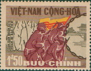 Bức tranh thứ ba và thứ tư là 2 con tem của VNCH được in khẩu hiệu “Toàn dân đoàn kết, chuẩn bị Bắc tiến” với đích cắm cờ ba que là Chùa Một Cột của Hà Nội.