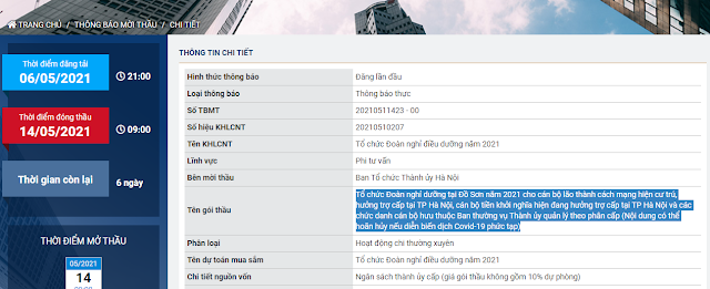 Phần mầu xanh trong anh ghi rõ tên gói thầu: “Tổ chức Đoàn nghỉ dưỡng tại Đồ Sơn năm 2021 cho cán bộ lão thành cách mạng hiện cư trú, hưởng trợ cấp tại TP Hà Nội, cán bộ tiền khởi nghĩa hiện đang hưởng trợ cấp tại TP Hà Nội và các chức danh cán bộ hưu thuộc Ban thường vụ Thành ủy quản lý theo phân cấp”. Tất nhiên chúng ta không thể bỏ qua phần trong ngoặc đơn là “Nội dung có thể hoãn hủy nếu diễn biến dịch Covid-19 phức tạp”.