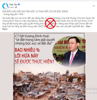 Trong Chương trình hành động khi ứng cử đại biểu Quốc hội khóa XV, Chủ tịch Quốc hội Vương Đình Huệ có nêu một trong những nhiệm vụ trọng tâm sẽ thực hiện là quan tâm giải quyết những bức xúc về đất đai. Trước vấn đề này, Việt Tân cùng một số đối tượng dân chủ đã nhanh chóng “ăn bám” sự kiện, cố tình bôi lem, hạ thấp uy tín của Chủ tịch Quốc hội bằng lập luận cho rằng: “lời hứa hẹn như vừa nêu của Chủ tịch Quốc hội Vương Đình Huệ không có gì mới lạ và cũng không mang lại chút hy vọng gì về vụ việc của họ được giải quyết rốt ráo”. Đồng thời, các đối tượng này cũng ráo riết tung ra luận điệu đòi thay đổi quy định của Hiến pháp về sở hữu đất đai. Cụ thể, những kẻ này cho rằng: “phải chuyển từ chế độ sở hữu toàn dân đối với toàn bộ đất đai sang chế độ đa sở hữu về đất đai, trong đó có sở hữu tư nhân”, “Muốn tư nhân hóa thì thứ nhất phải đa đảng. Phải tự do lập hội và tự do ngôn luận. Thứ hai là sở hữu tư nhân. Thứ ba là tư pháp độc lập. Sở hữu tư nhân phải có tư pháp độc lập”, “Thay đổi Luật Đất đai phải thay đổi thể chế chính trị”.