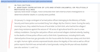 Vào ngày 30/03/2021, Cục Dân chủ, Nhân quyền và Lao động thuộc Bộ Ngoại giao Mỹ đã công bố Báo cáo Nhân quyền năm 2020, trong đó đánh giá tình hình nhân quyền ở các quốc gia là thành viên Liên Hiệp Quốc. Phần báo cáo về Việt Nam dài 45 trang, và chứa nhiều nhận định tiêu cực.