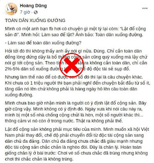 Một bức ảnh người dân Cuba căng băng rôn xuống đường biểu tình được Hoàng Dũng lấy ra minh họa cho bài đăng “nửa nạc nửa mỡ” của mình. Đọc toàn bộ nội dung mà Hoàng Dũng đăng tải, chúng ta không thấy cái lý nào chấp nhận được cả, tất cả những câu chữ mà Hoàng Dũng viết ra chỉ để cố tình dẫn dụ, khắc sâu vào tâm trí người dân phải “xuống đường biểu tình” lật đổ chế độ.