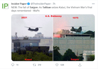 Sự kiện Mỹ rút ống thở khiến chính quyền Kabul sụp đổ, và sau đó là các cuộc tháo chạy khỏi Afghanistan. Cảnh tượng đó khiến chúng la liên tưởng tới sự kiện ngụy quân, ngụy quyền VNCH cùng quan thầy tháo chạy khỏi miền Nam Việt Nam vào tháng Tư năm 1975. Hai sự kiện này giống nhau về hình thức nhưng khác biệt nhau hẳn về bản chất. Bạn đọc thiếu tỉnh táo sẽ ăn bả địch.