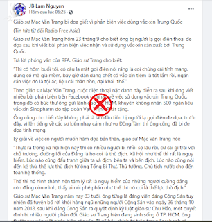 Mới đây Mạc Văn Trang nói với BBC rằng, ông ta bị người lạ mặt gọi điện dọa giết chỉ vì phản biện, phản đối Vaccine của Trung Quốc. Với được tin này, BBC vội vã lên bài ám chỉ ông Mạc Văn Trang bị chính quyền cho người dọa giết. Đương nhiên, Trang già đọc lại mà không phản đổi.