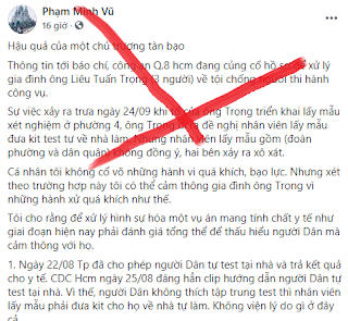 Mới đây nhất, vào hôm qua 25/9, Phạm Minh Vũ đã lợi dụng vụ 3 người trong một gia đình tấn công nhân viên y tế bị công an quận 8 TPHCM lập hồ sơ xử lý về tội chống người thi hành công vụ để tuyên truyền rộng rãi rằng, chủ trương lấy mẫu xét nghiệm Covid-19 là sai lầm, lãng phí, bạo lực, là lợi ích nhóm… qua đó kích động người dân không chấp hành các quy định chống dịch. Cũng trong bài viết, Phạm Minh Vũ đổi trắng thay đen, biến một người có hành vi vi phạm pháp luật trở thành “nạn nhân của một chính sách sai lầm, bạo lực”, qua đó kích động người dân chĩa mũi giáo vào chế độ.