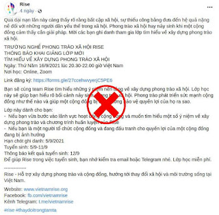 Một thông báo tạm gọi là “tuyển sinh” nhưng không phải tuyển sinh Đại học hay Trung học Phổ thông mà là kêu gọi người dân tham gia “lớp tìm hiểu về xây dựng phong trào xã hội”. Chủ nhân của bài đăng thông báo này là RISE – “con đẻ” của tổ chức khủng bố Việt Tân.