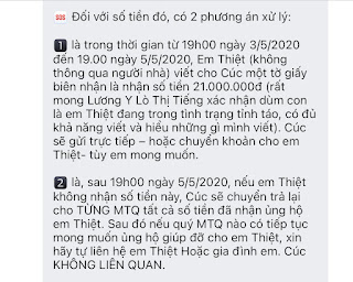 “Bây giờ có hai phương thức, một là chị Hương (dì của Thiệt) cho qua chỗ Thiệt để gửi 19,7 triệu đồng. Hai là trả lại cho Mạnh Thường Quân, có sao kê, có danh sách đàng hoàng”.