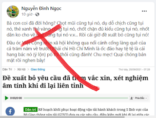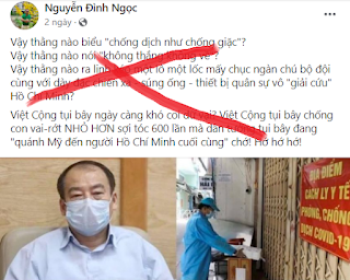 Trong một bài viết trước đó, Nguyễn Đình Ngọc công khai kích động người dân chống lại chính sách phòng dịch, bằng cách bơm bít vào đầu người đọc nhưng thông tin quy chụp: “Bà con coi đã đời hông? Chọt mũi cũng tụi nó, dụ dỗ chịch cũng tụi nó, thẻ xanh thẻ vàng cũng tụi nó, chốt chặn đủ kiểu cũng tụi nó, nhốt dân ko cho về quê cũng tụi nó v.v… Rồi cái giờ đề xuất bỏ cũng tụi nó! Đầu óc Việt Cộng nhìn xã hội không qua nổi cánh cổng làng quê của cả trăm năm về trước! Phải chi Hồ Chí Minh là ốc đảo hay tệ tệ là cái hang bác nó (ý lộn) pó thì thôi cũng đành! Chu mẹc! Quại chóng bản mặt rồi nghen bây!”.