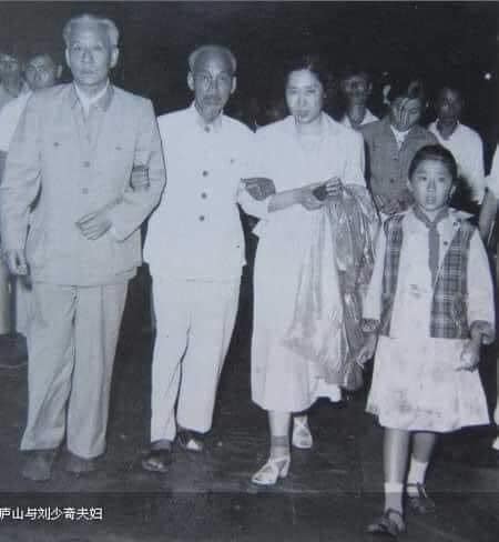 Chủ tịch Hồ Chí Minh từng có thời gian dài hoạt động ở Trung Quốc và nhiều lần gặp gỡ lãnh đạo cấp cao của Trung Quốc, trong đó có Lưu Thiếu Kỳ khi ấy đang là Chủ tịch Trung Quốc. Bức ảnh mà ta thấy là Chủ tịch Hồ Chí Minh cùng Lưu Thiếu Kỳ cùng vợ là Vương Quang Mỹ (Người vợ thứ ba của Lưu Thiếu Kỳ) tại Lư Sơn.