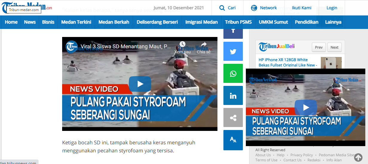 Chỉ vài thao tác đơn giản tôi đã tìm ra bức ảnh đó. Đây là những bức ảnh được cắt ra từ một clip có tên bằng tiếng Indonesia: “Viral 3 Siswa SD Menantang Maut, Pulang Sekolah Terpaksa Pakai Kotak Styrofoam Seberangi Sungai”, tạm dịch là: “Ba học sinh Tiểu học thách thức cái chết, phải dùng thùng xốp để qua sông”. Clip được đăng vào lúc 15h34′ ngày 25/10/2021 trên trang Tribun-Medan.com. Mời xem ảnh và link kiểm chứng bên dưới: