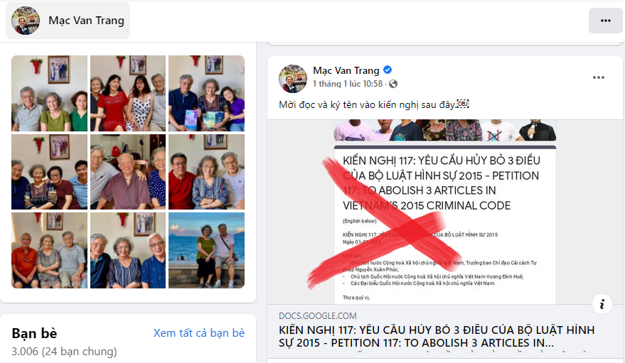 Anh dân chủ già Mạc Văn Trang đang kêu gào mọi người ký tên vào một bản kiến nghị có tên “KIẾN NGHỊ 117: YÊU CẦU HỦY BỎ 3 ĐIỀU CỦA BỘ LUẬT HÌNH SỰ 2015”, gọi tắt là Kiến nghị 117. Trong bản Kiến nghị này, những kẻ như Mạc văn Trang công khai yêu cầu đòi hủy bỏ các Điều 117 và 331 của Bộ luật Hình sự 2015; Hủy bỏ (hoặc sửa đổi bằng quy định rõ ràng để không ai có thể hiểu lầm) Điều 109 của Bộ luật Hình sự 2015. Mời xem ảnh chụp màn hình bên cạnh.