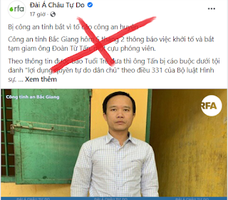 Sau khi cơ quan CSĐT công an tỉnh Bắc Giang vừa ban hành quyết định khởi tố bị can đối với Đoàn Từ Tấn (SN 1982, trú tại N02, chung cư 282, đường Lĩnh Nam, Hoàng Mai, Hà Nội) cựu phóng tạp chí Môi trường và sức khỏe về tội “Lợi dụng các quyền tự do dân chủ xâm phạm lợi ích của Nhà nước, quyền, lợi ích hợp pháp của cá nhân” thì ngay lập tức Đài Á Châu Tự do (RFA) đã nhảy vào xuyên tạc, rằng Đoàn Từ Tấn “Bị công an tỉnh bắt vì tố cáo công an huyện”.