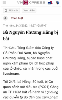 Bà Nguyễn Phương Hằng bị công an TPHCM khởi tố vụ án, khởi tố bị can và bắt tạm giam về hành vi lợi dụng quyền tự do dân chủ xâm phạm lợi ích của Nhà nước, quyền và lợi ích của cá nhân vào ngày hôm qua 24/3/2022.
