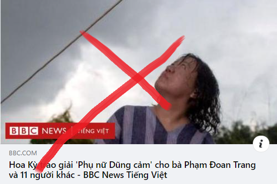 BBC loan tin Bộ Ngoại giao Hoa Kỳ ra thông báo về lễ trao giải Phụ nữ Quốc tế Dũng cảm cho Phạm Đoan Trang và 11 người khác trên thế giới và Phu nhân tổng thống Mỹ Jill Biden có bài phát biểu tại sự kiện trực tuyến này vào ngày 14/3/2022. Cũng theo Bộ Ngoại giao Hoa Kỳ, Phạm Đoan Trang được đưa vào danh sách nhận giải cùng với các phụ nữ từ Myanmar, Iraq, Liberia, Libya, Romania, Nam Phi, Moldova, Colombia, Brazil, Nepal và Bangladesh.