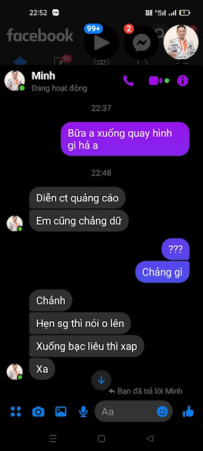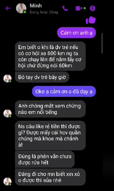 Trong cuộc trò chuyện, N.P.Y. cũng tiết lộ thêm một đoạn tin nhắn Minh Béo miệt thị mình vì từ chối gặp mặt: “Nghệ sĩ câu like rẻ tiền thì được gì? Được mấy cái huy chương vàng quần chúng mà khoe mà chảnh à! Đúng là phèn vẫn chưa rửa được hết. Đăng đi cho mọi người biết mày xin xỏ không được thì sủa nhé”.