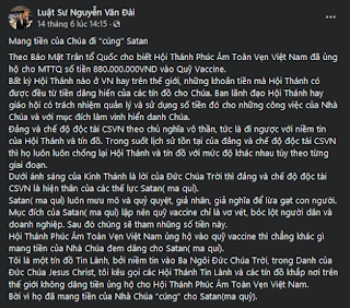 Mùa hè năm 2021, khi dịch COVID-19 đang hoành hành ở Việt Nam, Đài đã lên tiếng khi biết Hội thánh Phúc âm Toàn vẹn Việt Nam vừa ủng hộ 800 triệu VNĐ cho Quỹ Vaccine phòng dịch. Thay vì ủng hộ nghĩa cử này, Đài nói rằng Hội thánh vừa nêu đang “mang tiền của nhà Chúa dâng cho Satan”, vì cộng sản là vô thần, mà đối với người Kito giáo thì vô thần là ma quỷ. Khi nói vậy, rõ ràng Đài không công nhận sự bình đẳng giữa người vô thần và người có tôn giáo, cũng không công nhận quyền tự do tư tưởng của những người vô thần. Nghĩa là Đài không hề công nhận rằng quyền con người có tính phổ quát.