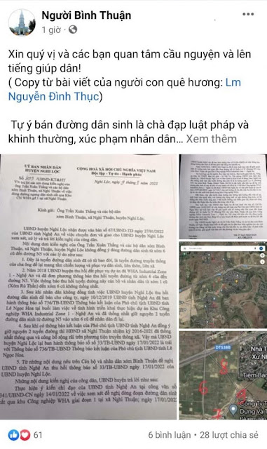 Liên quan đến việc chăm sóc người dân, vào chiều 21/3/2022, khi Cty Nam Sơn triển khai lắp đặt đường ống nước sạch cho xóm 3, xóm Bình Thuận, Rú Thần, Khánh Thiện, xã Nghi Thuận, huyện Nghi Lộc, hàng trăm giáo dân xứ Bình Thuận đã xông vào hiện trường lăng mạ, vu vạ chính quyền cướp đất, và dùng vũ khí thô sơ tấn công tài xế máy xúc và cán bộ địa chính xã, gây ách tắc Quốc lộ 7C.
