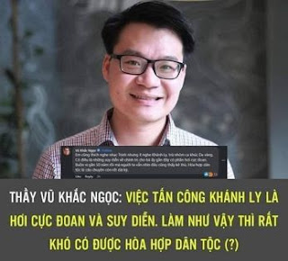 Anh thợ dạy hóa Vũ Khắc Ngọc nói rằng, vừa quan dân mạng “tấn công” ca sĩ Khánh Ly dựa vào câu hát “nội chiến” trong bài “Gia tài của mẹ” khi về Việt Nam biểu diễn ở Đà Lạt là cực đoan và suy diễn, thậm chí anh còn cho rằng, “tấn công” như vậy thì “không thể có được hòa hợp dân tộc”.