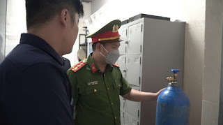 Đồng thời, các trinh sát ập vào, bắt quả tang nhân viên của quán đang bơm “bóng cười” cho khách. Một bình khí cỡ lớn loại 50 – 55kg đã bị thu giữ.