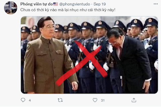 Sáng nay 20/9 vào twitter thấy nick Phóng viên tự do đăng dòng tweets Chưa có thời kỳ nào mà lại nhục như cái thời kỳ này!” kèm theo đó là bức ảnh nguyên TBT Nông Đức Mạnh đang cúi đầu cung kính trước Hồ Cẩm Đào. Dòng tweets nhanh chóng thu hút sự chú ý đám dân chủ ba sọc bại não, đặc biệt là đám đang sống cuộc đời hủi nô vong quốc.