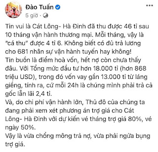 Tiếp nối Mạc văn Trang, Nguyễn Xuân Toản… về chuyện đường sắt Cát Linh – Hà Đông, mới đây, anh Đào Tuấn lại cũng lên tiếng (xem ảnh chụp màn hình bên cạnh). Thôi thì, mỗi anh mỗi góc nhìn, nhà nước nhìn dưới góc độ phục vụ nhân dân thì đó là lãi đậm, nhưng ai đó lấy hệ quy chiếu của một con buôn làm thước ngắm thì đúng là lỗ thật.