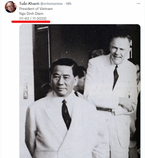 Mới đây, tay dzân chủ 3 que Tuấn Khanh vừa đăng ảnh Ngô Đinh Diệm trên Twitter và chú thích đó là Tổng thống Việt Nam Ngô Đình Diệm (11/63/11-2022). Có lẽ đó là tình cảm của Tuấn Khanh dành cho Ngô Đình Diệm hay chính xác hơn là chế độ tay sai bán nước, gia đình trị Ngô Đình Diệm.